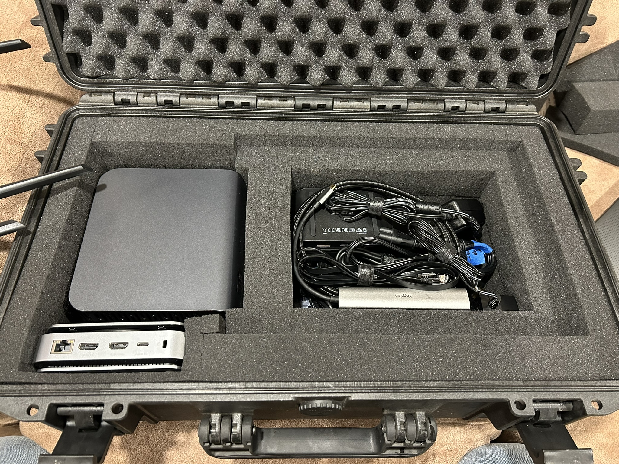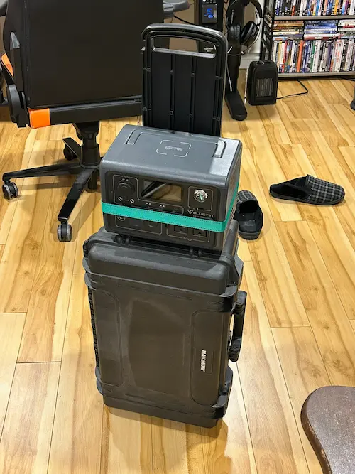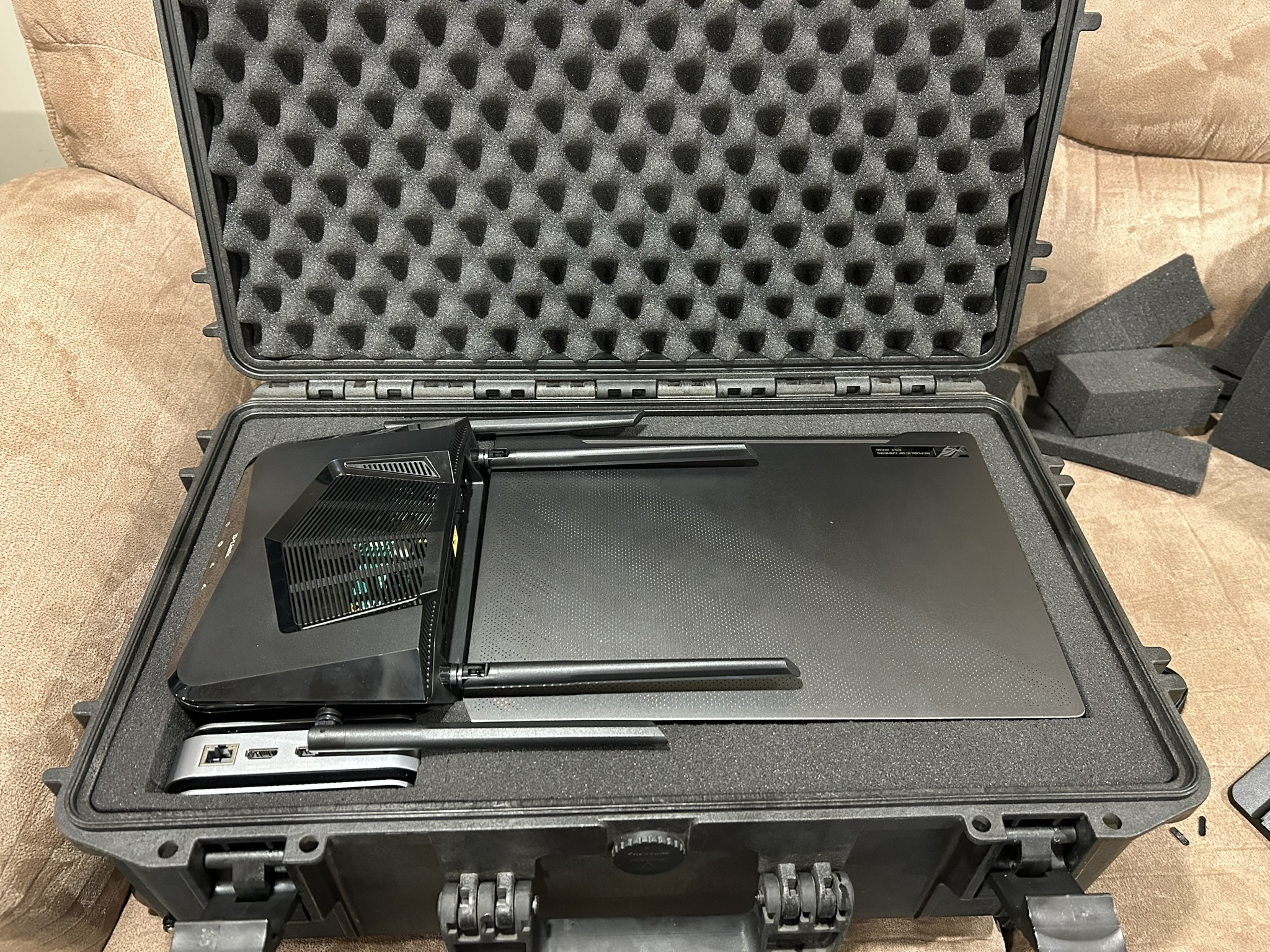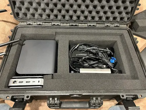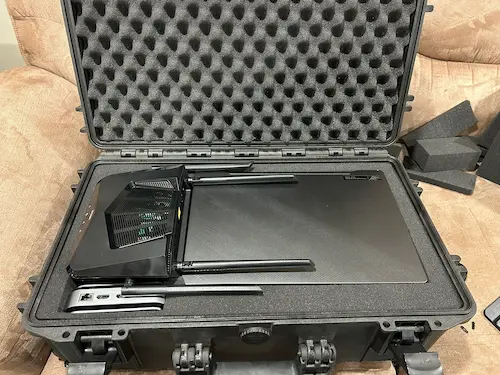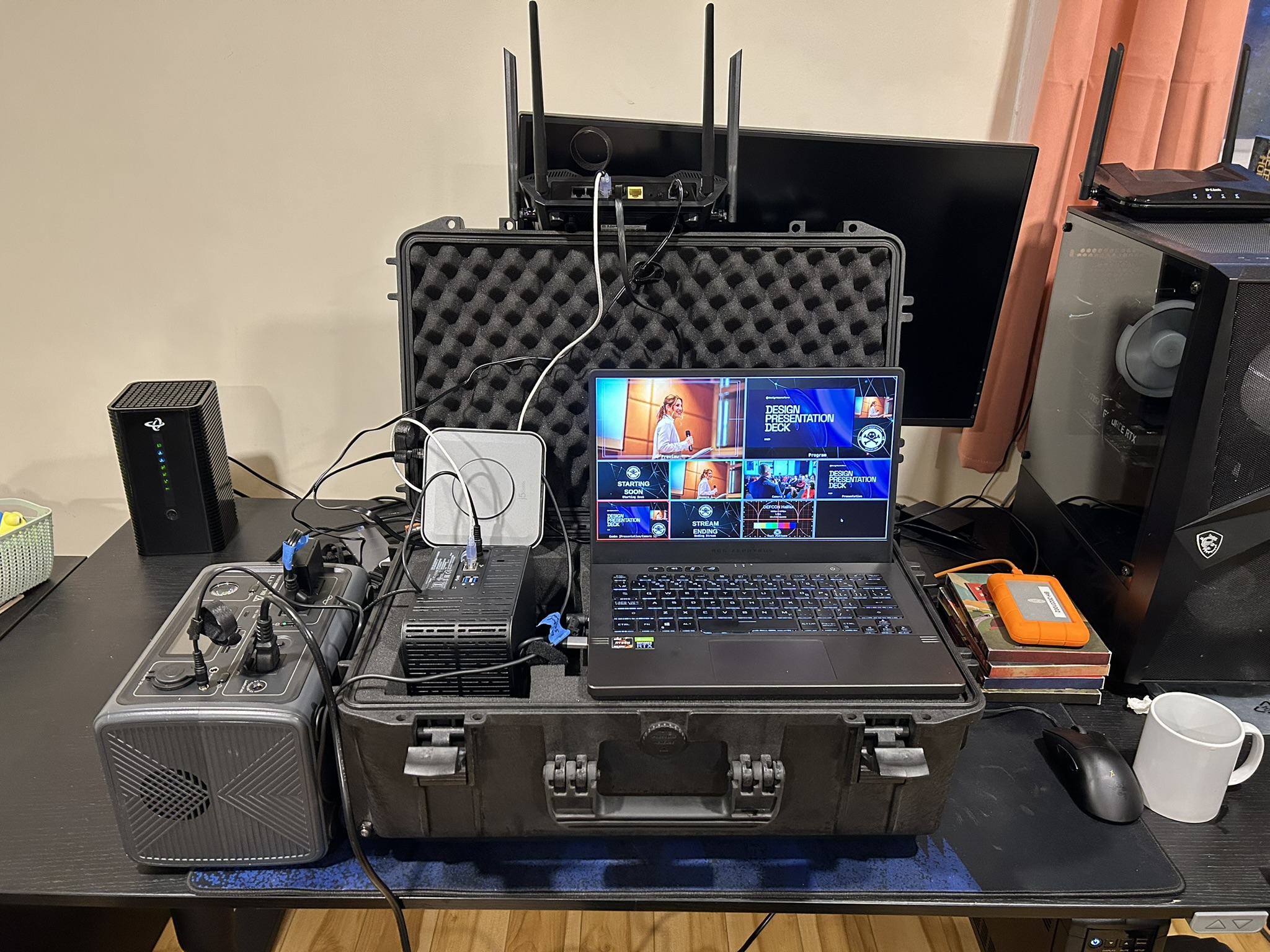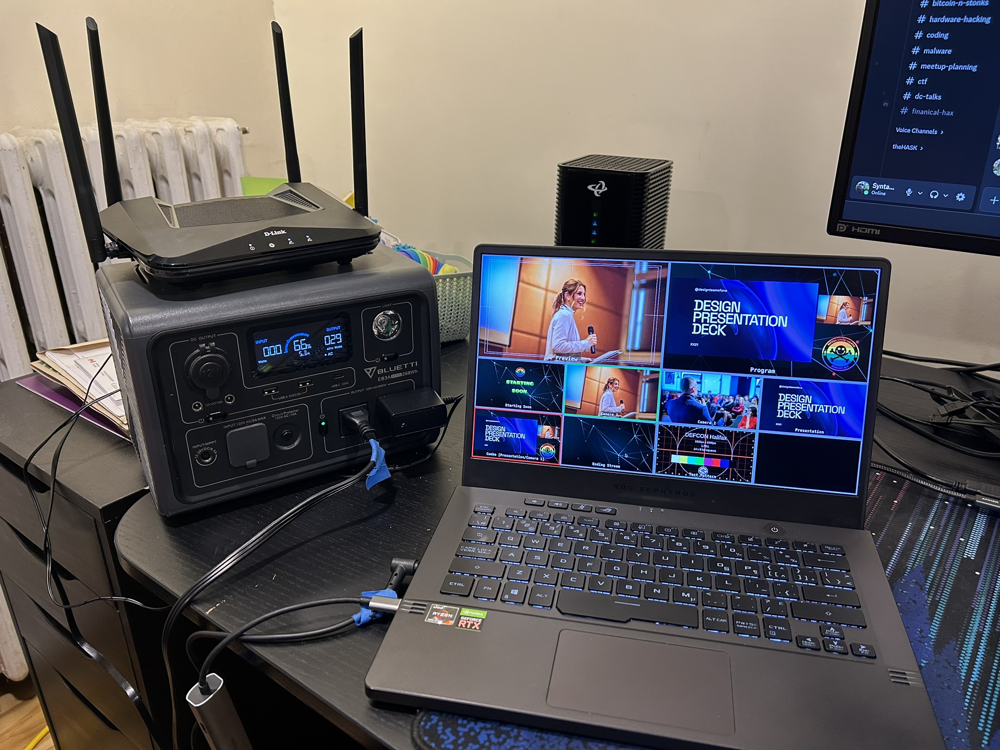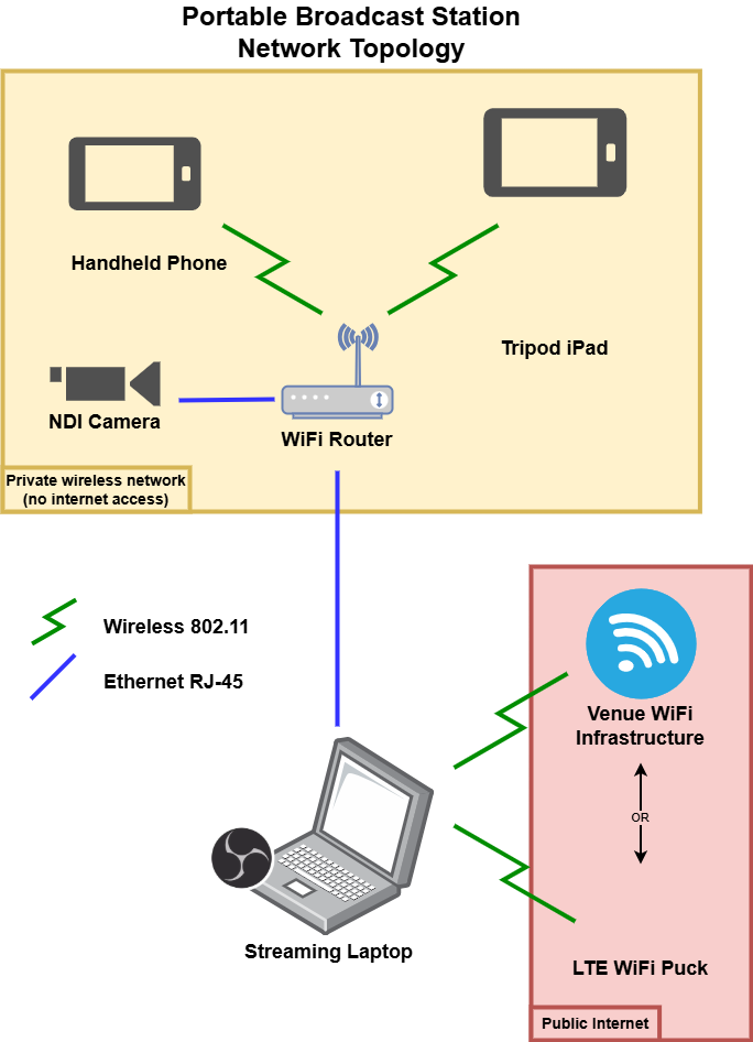Using recycled hardware and scrap components I hacked together a portable live streaming kit. Smart phones, using the NDI protocol over WiFi, serve as our cameras. An old consumer WiFi router is being used to route the camera feeds to the broadcast laptop. The broadcast laptop is an old Asus gaming laptop with Ubuntu and OBS installed.